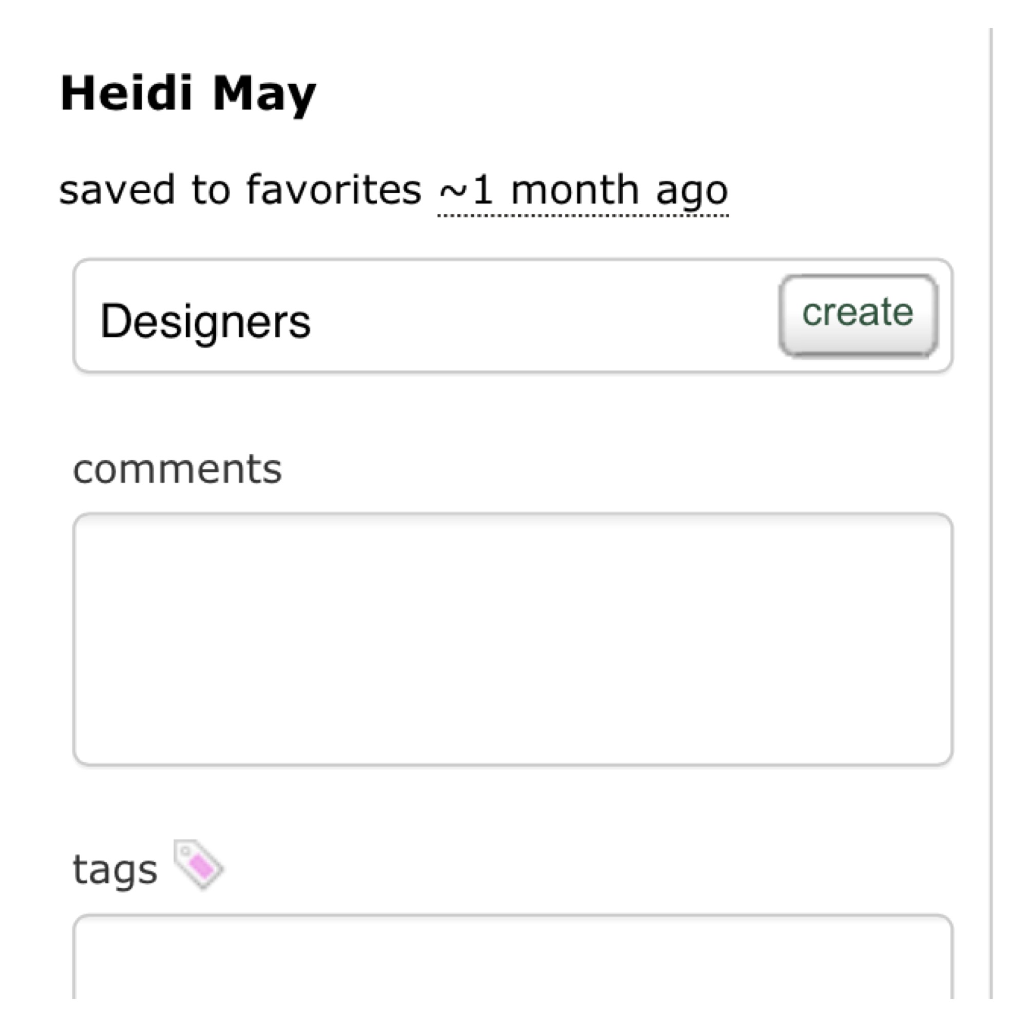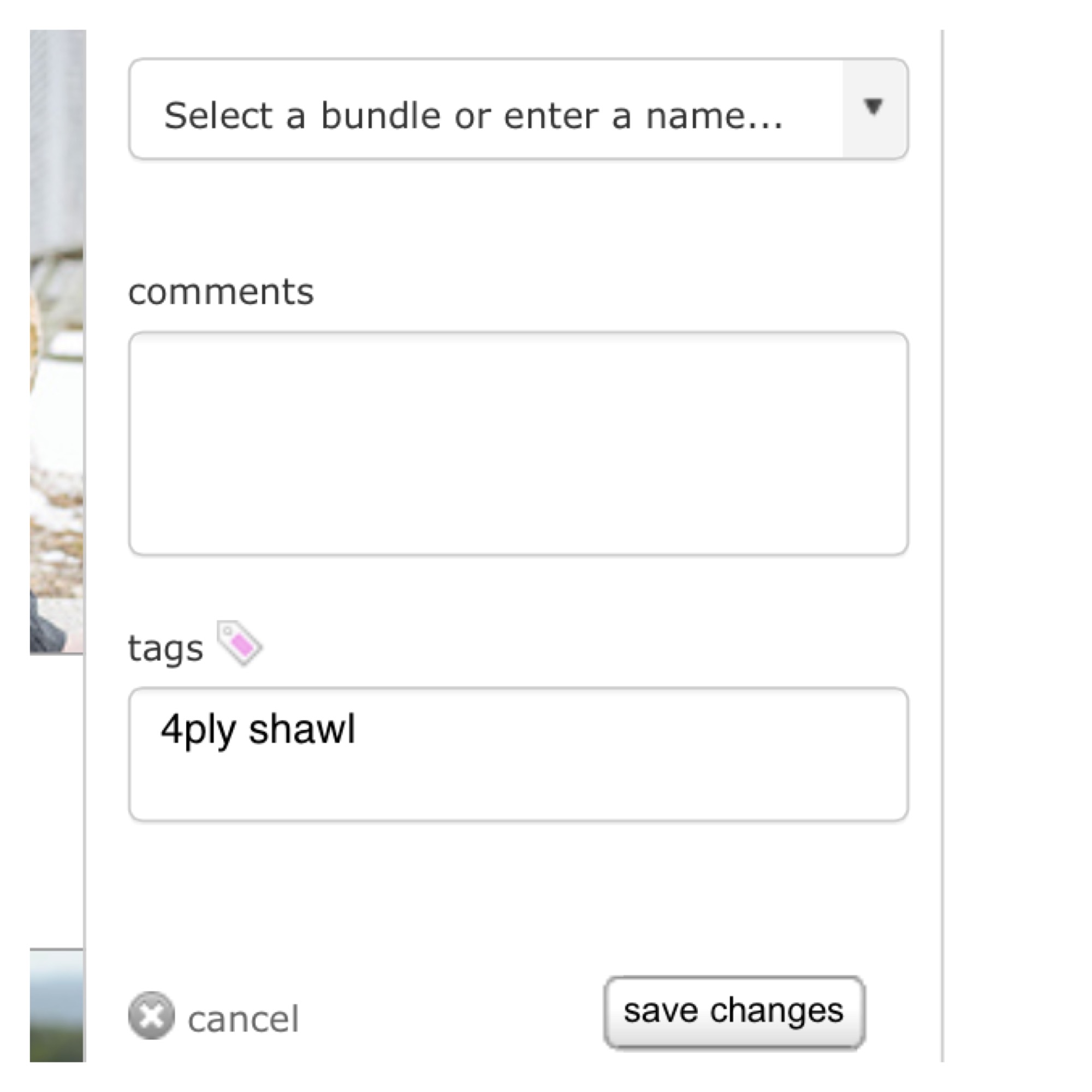 When you enter a new category, a tab will come up underneath saying create – be sure to click this.  You’ll notice you have the options to add comments, if you like.  For me, I’d find this an incredibly useful way of remembering which yarn I’d like to use to complete the project.  You’re original tags (if you used them) are also displayed and you have the option to add more or delete them.  At the bottom of this pop up there’s a tab that says Save Changes (sorry it’s not on my photo), remember to click this if you’ve added anything else to the comments or tag boxes.
