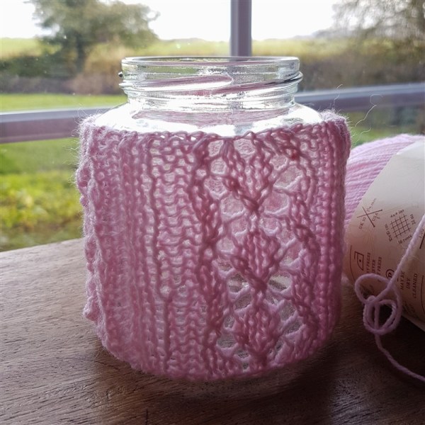 My first attempt came out far to big and I ended up reducing the number of stitches and my needle size.  The panel needed to be a little smaller than the circumference of the jar, so it would stretch to open the lace and also stay in place.
