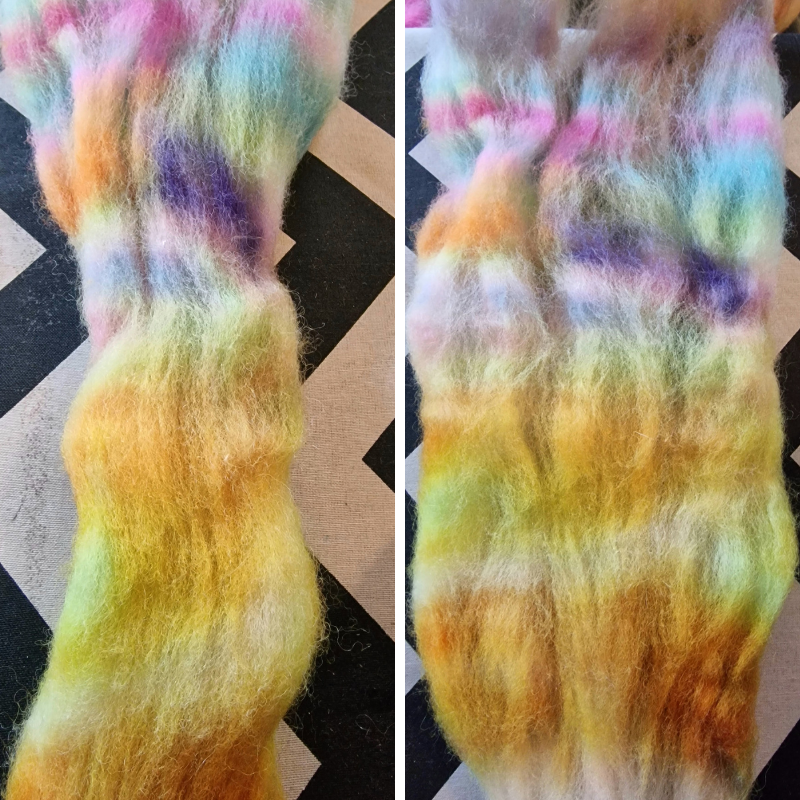 I think I’m going to ply it together with a strand of white mohair that I have in my stash, although I do wonder what it would look like plied with a strand of hot pink?