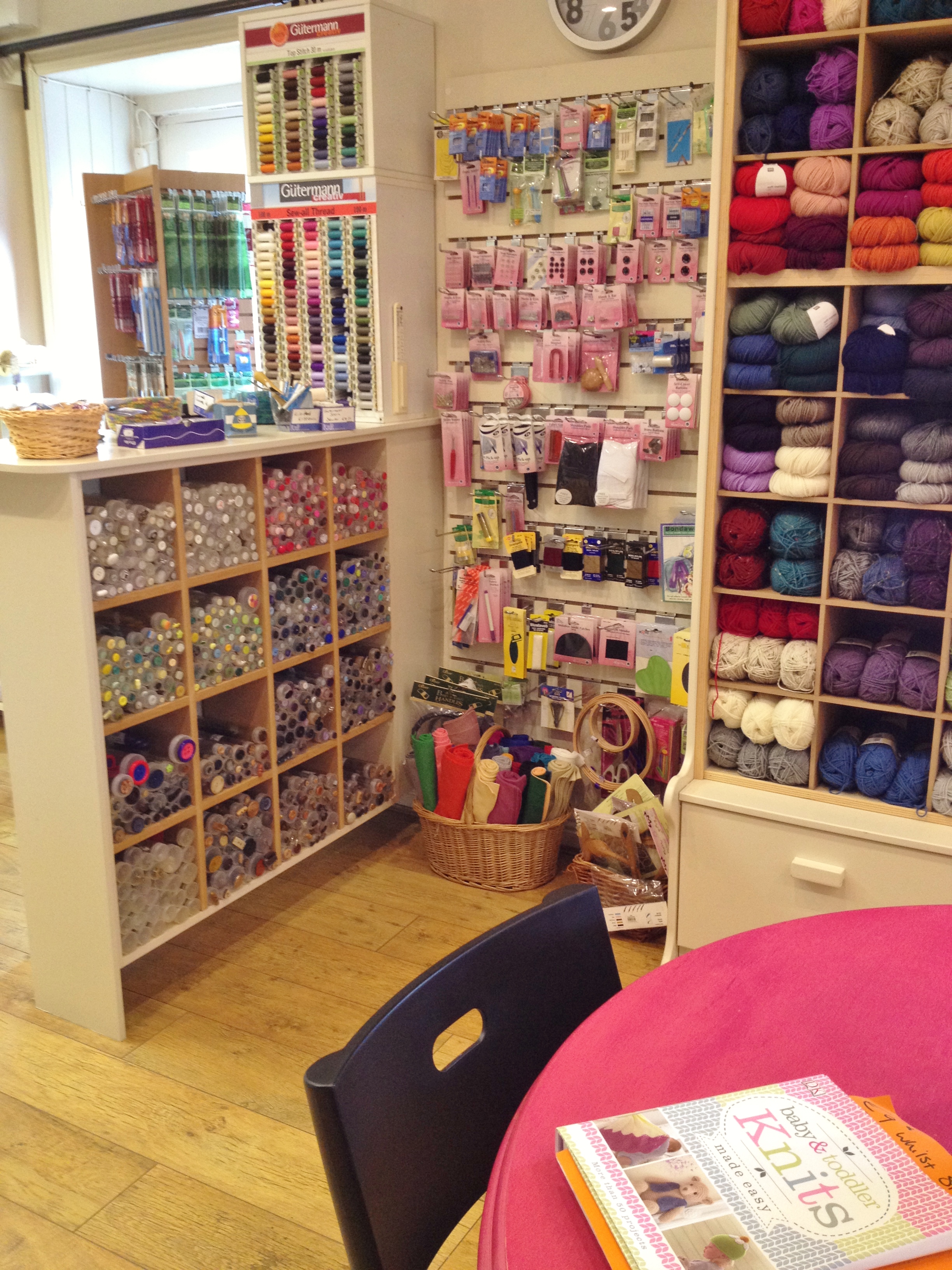 Looking down the shop there are shelves running down most of the left hand side to meet the counter, which we have moved in order to open up the shop floor completely. The shelves are packed with weights from 1ply to dk and we’ve managed to do away with the pattern stand by slotting the folders and books in between the yarn.