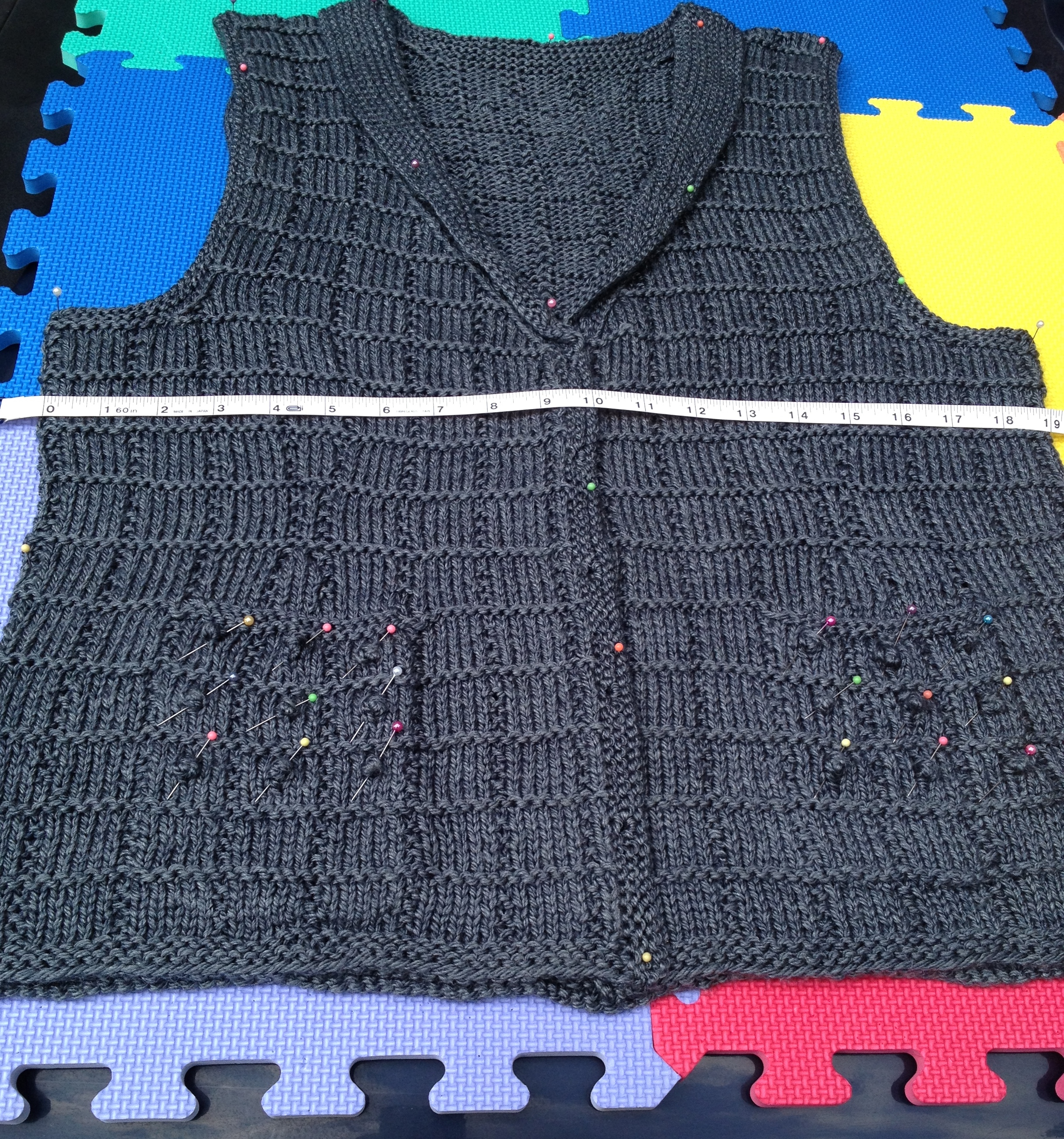 Use the actual measurements if available on your pattern. My waistcoat is supposed to be blocked to 36″ around the chest, but after being washed the yarn has relaxed a little and it is coming up at 38″. I’m happy with the extra roominess but would always advise you knit, wash and dry your tension square to ensure you knit the correct size. Obviously, I didn’t do that here – oops!