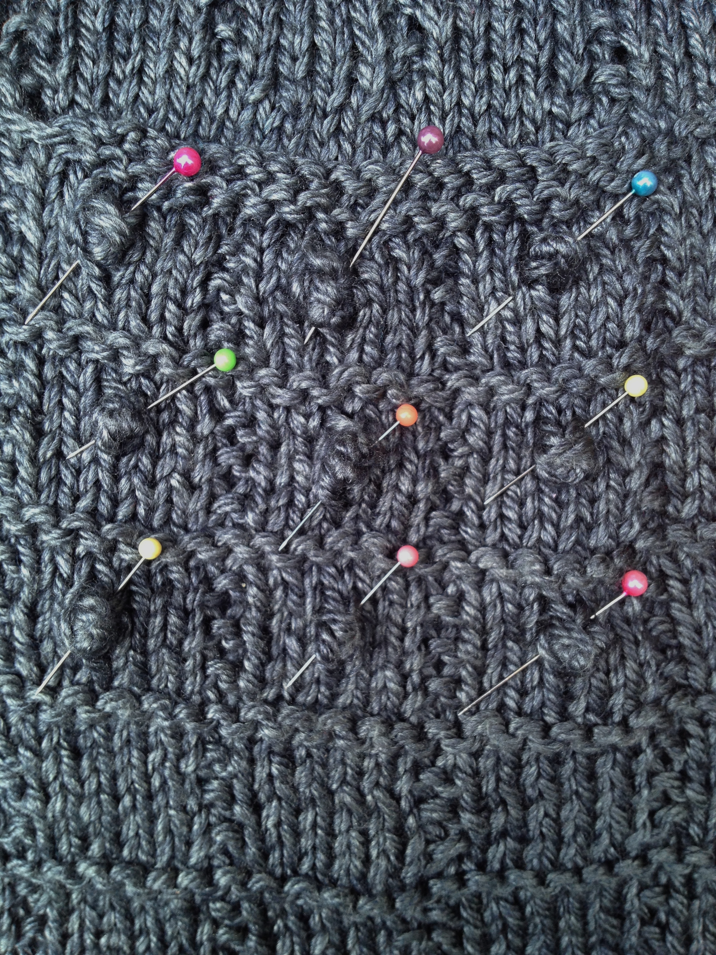I have used the pins to ensure my bands and collar lie properly (I hope so anyway) and have inserted extra pins under each bobble on the pockets to try and make them stand proud when dry.