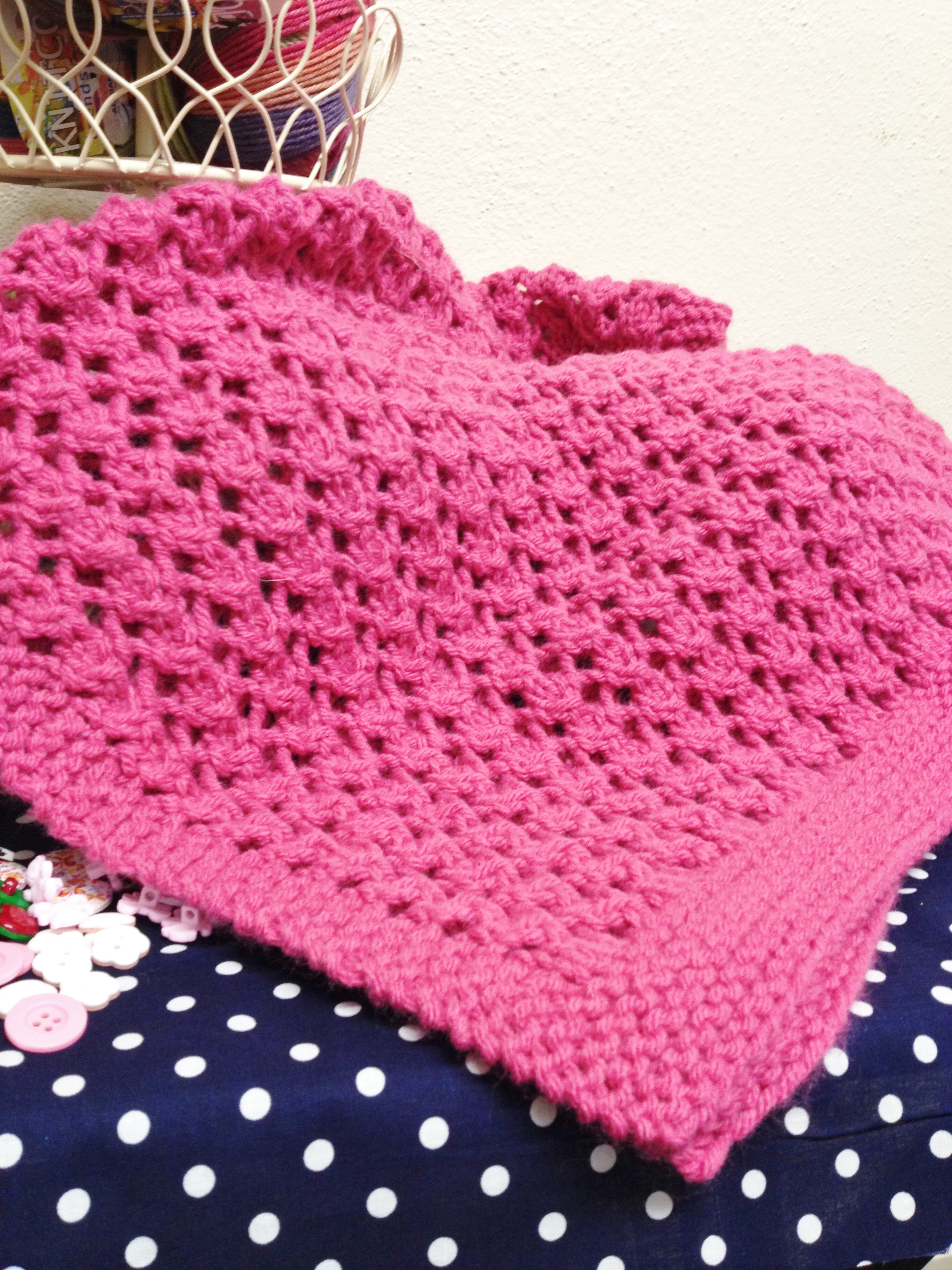 I’ve used Hayfield Baby Chunky and the blanket which is pram size only used 2 x 100g balls. The garter stitch border adds definition and there are only 4 rows to the lace pattern which becomes very memorable after a few repeats. This really was a quick knit and I can see it being a pattern I’ll use again and again, great for last minute knitting.