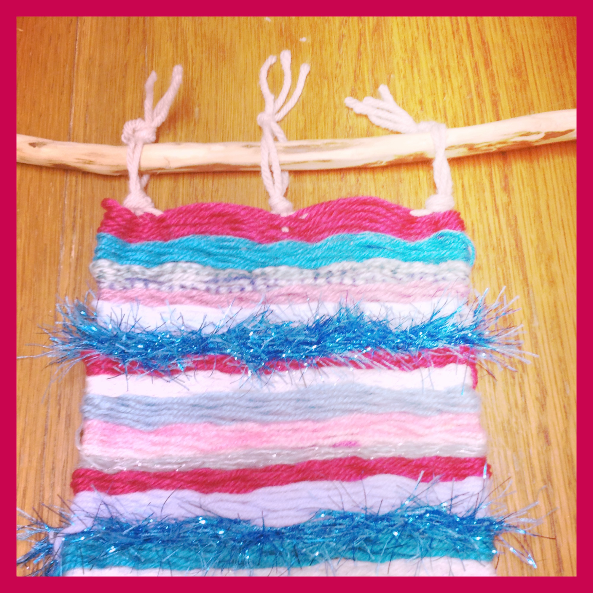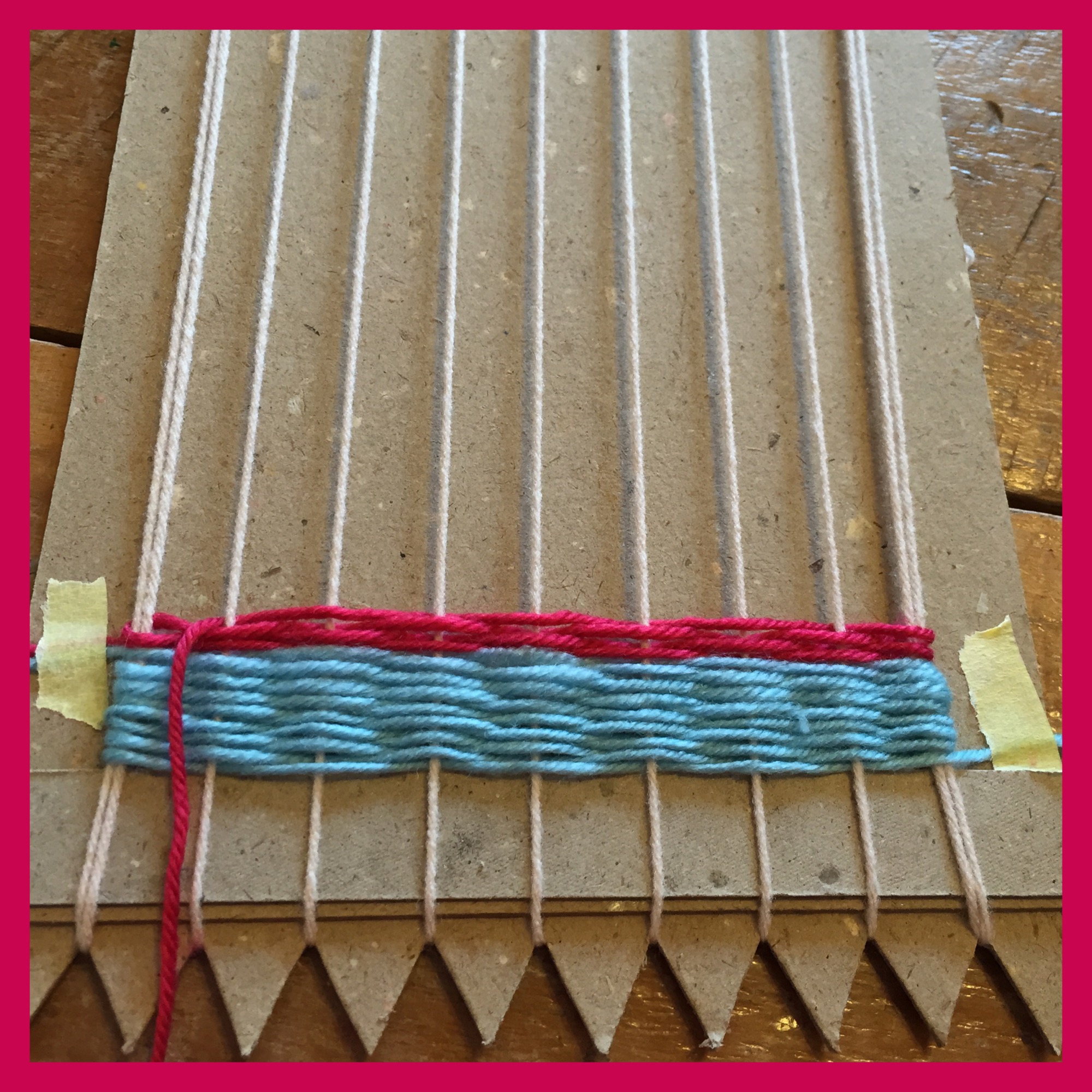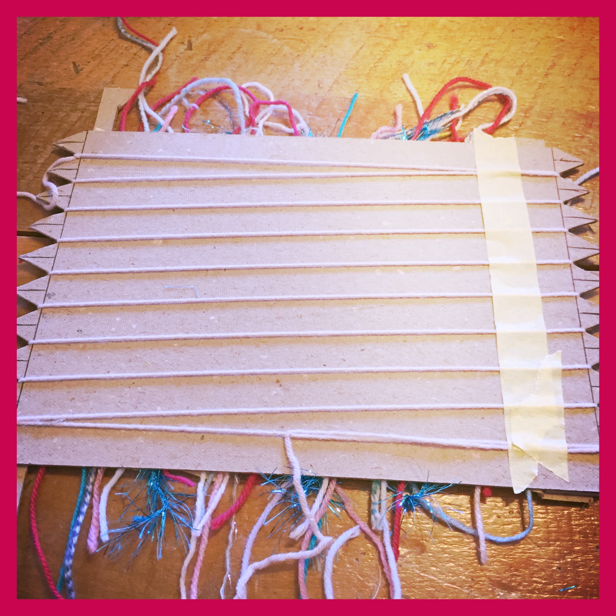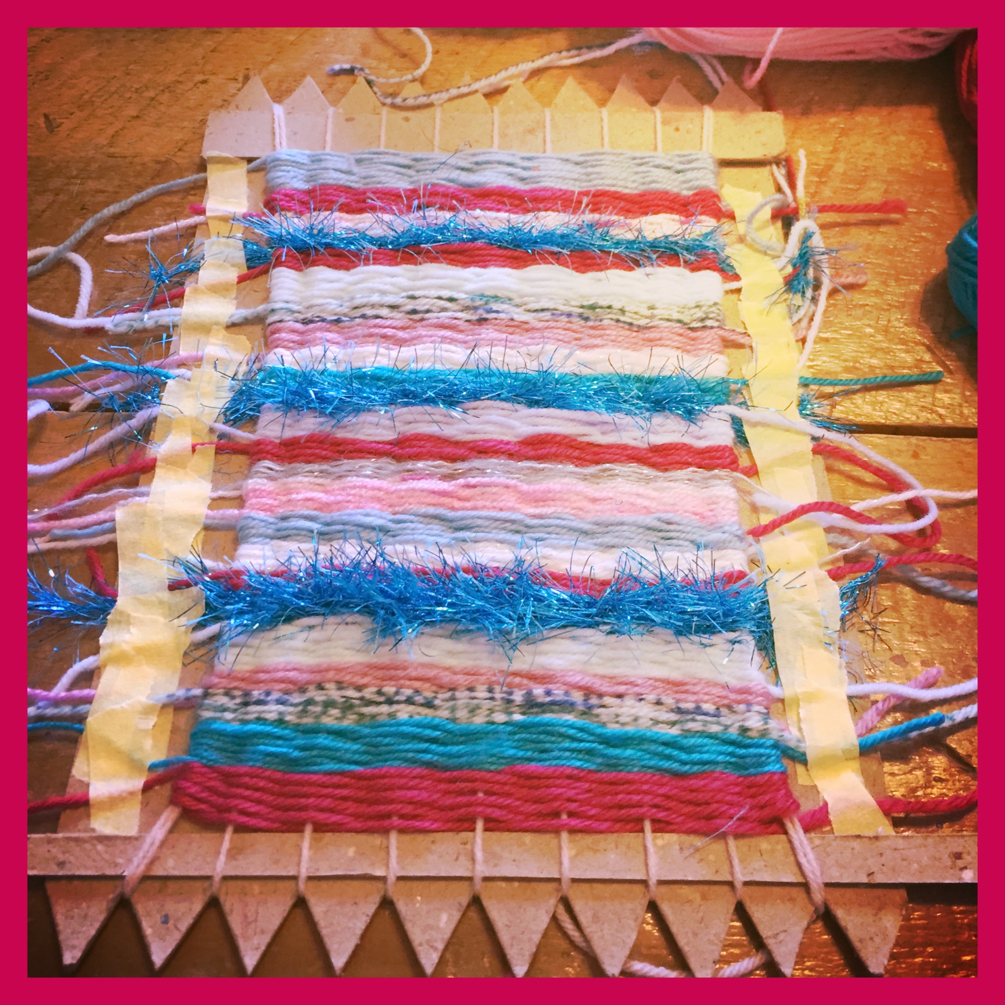 Having taught weaving to a group of children before I dug around and discovered an old loom I’d made with strong cardboard years ago and copied it, cutting ‘teeth’ out every 1.5cms.  Ensuring you have an even number of teeth to give you an odd number of wraps will make things easier (we had 9 warp threads) .  I wrapped the warp threads and tied them at the back so the girls could crack on with the weaving.