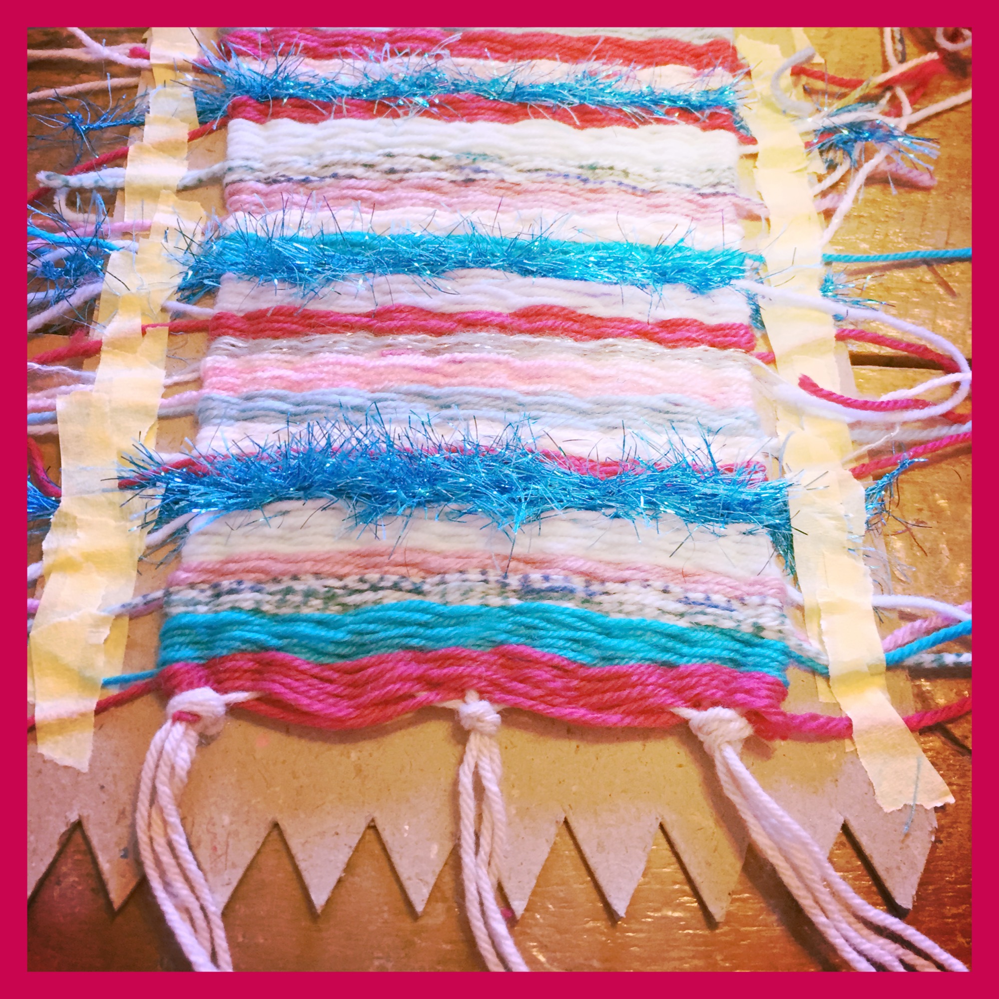 There were a few things I knew we’d struggle with, with the girls because of our limited time – namely the ends so I searched children’s weaving on Pinterest and happened upon artblog.com which used tape to secure the ends – perfect 🙂