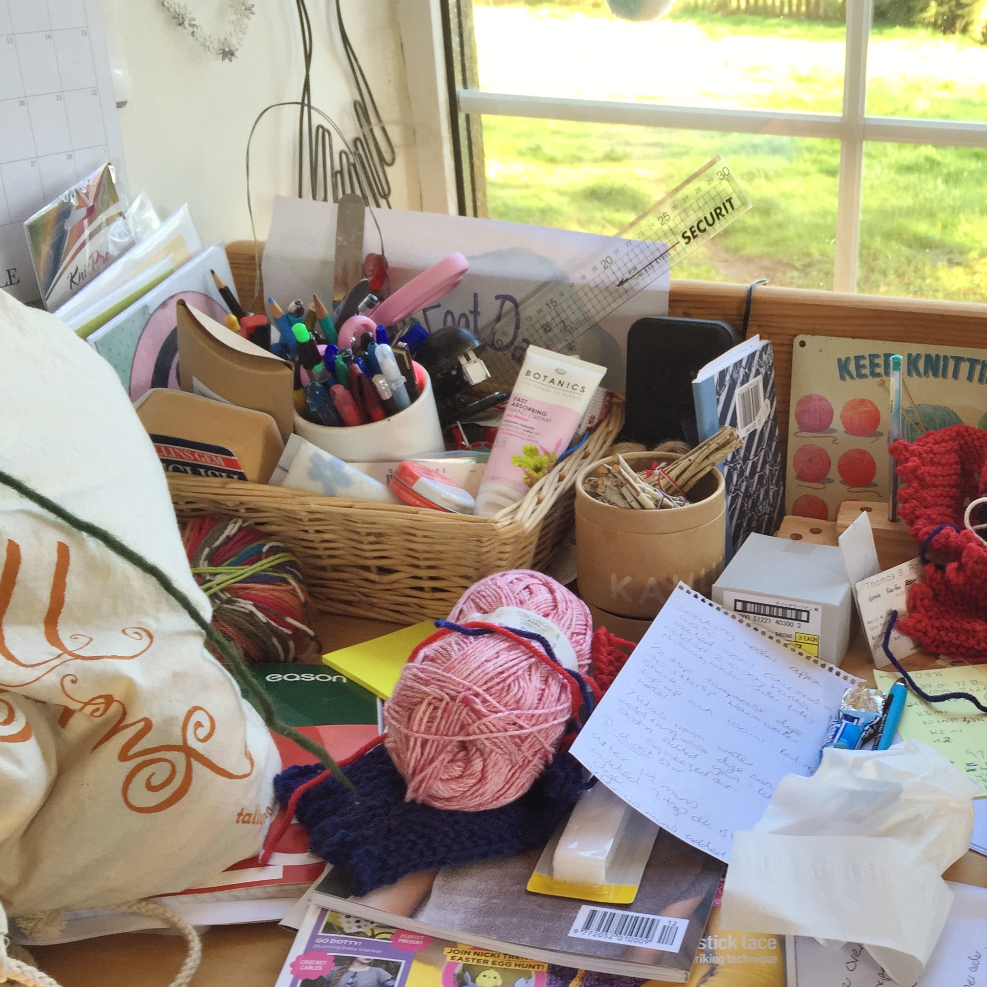The living room isn’t much better, except there’s only bits of one project sitting on the pouffe, well they’re samples.  They’re actually a rework of the samples that are strewn across my desk.  As if to prove a point as to the extremes of my ability to do the polar opposite of organise myself.  I have managed to mislay, the pattern for a daisy edged shawl I’d been working on for some time a couple of weeks back. That’s fine, I know they’ll eventually show up, except my afore mentioned, cold infected brain must have them now so I can get the shawl knitted, blocked and be wearing it tomorrow at the latest 😉