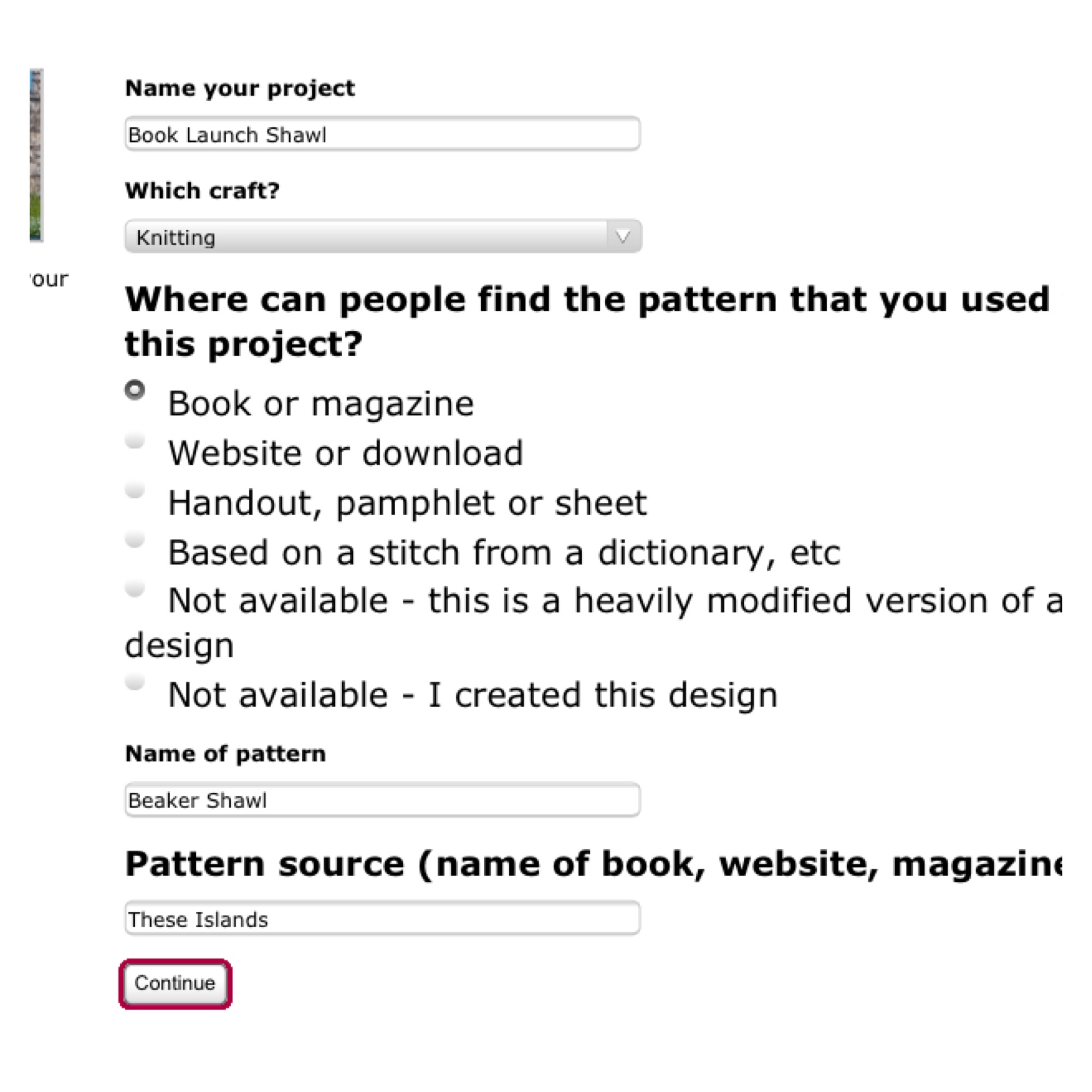 When you hit the continue button, Ravelry does some kind of voodoo magic and if it’s been added to their database, the next page to load, will have the details of the pattern on it. Click on the ‘choose this pattern’ tab to continue.