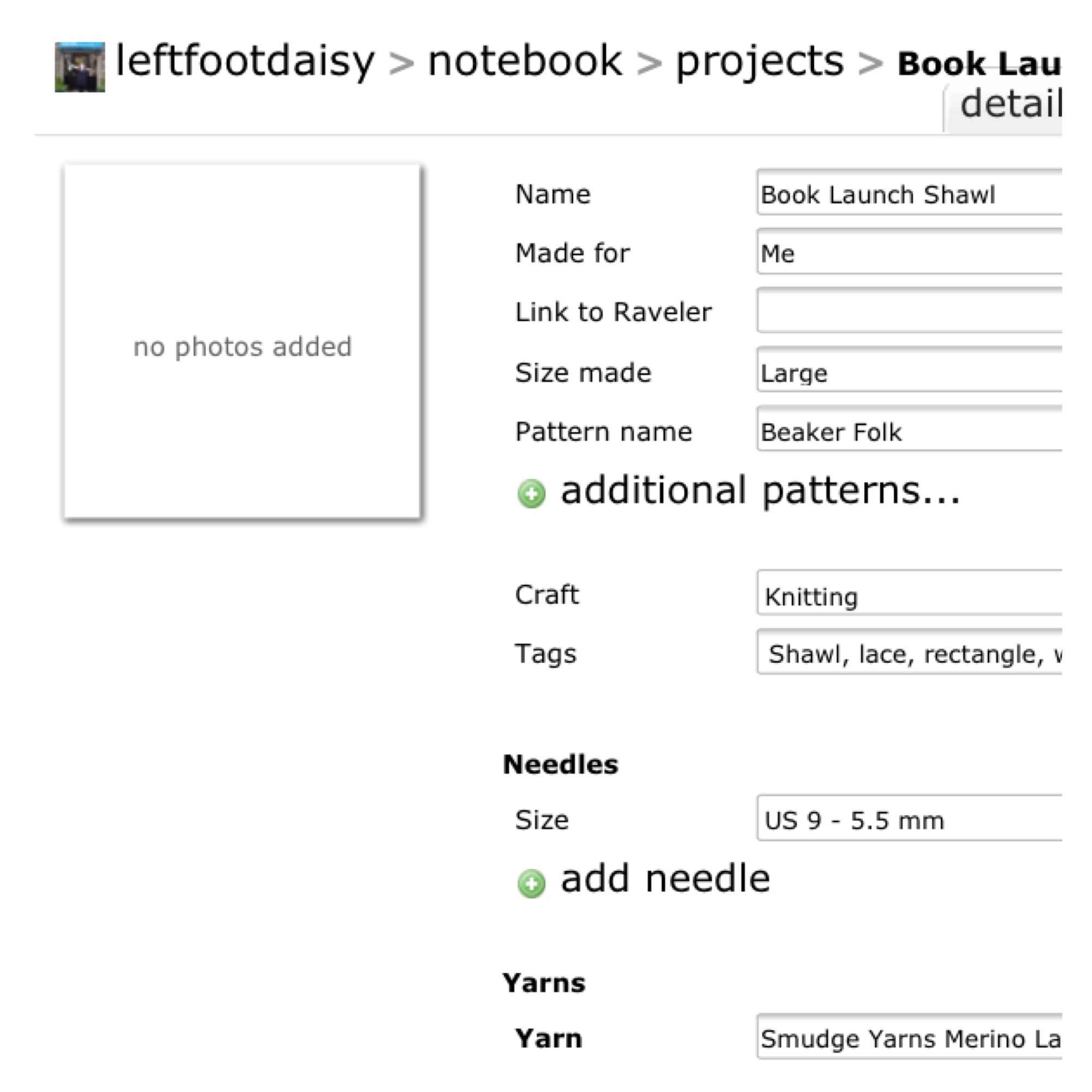 At the right hand side of the project page there’s places to add all manner of things, including how far along you are, when you began and if you’re enjoying it. Underneath you’ve also got options to record more detail about your take on the yarn and the design.
