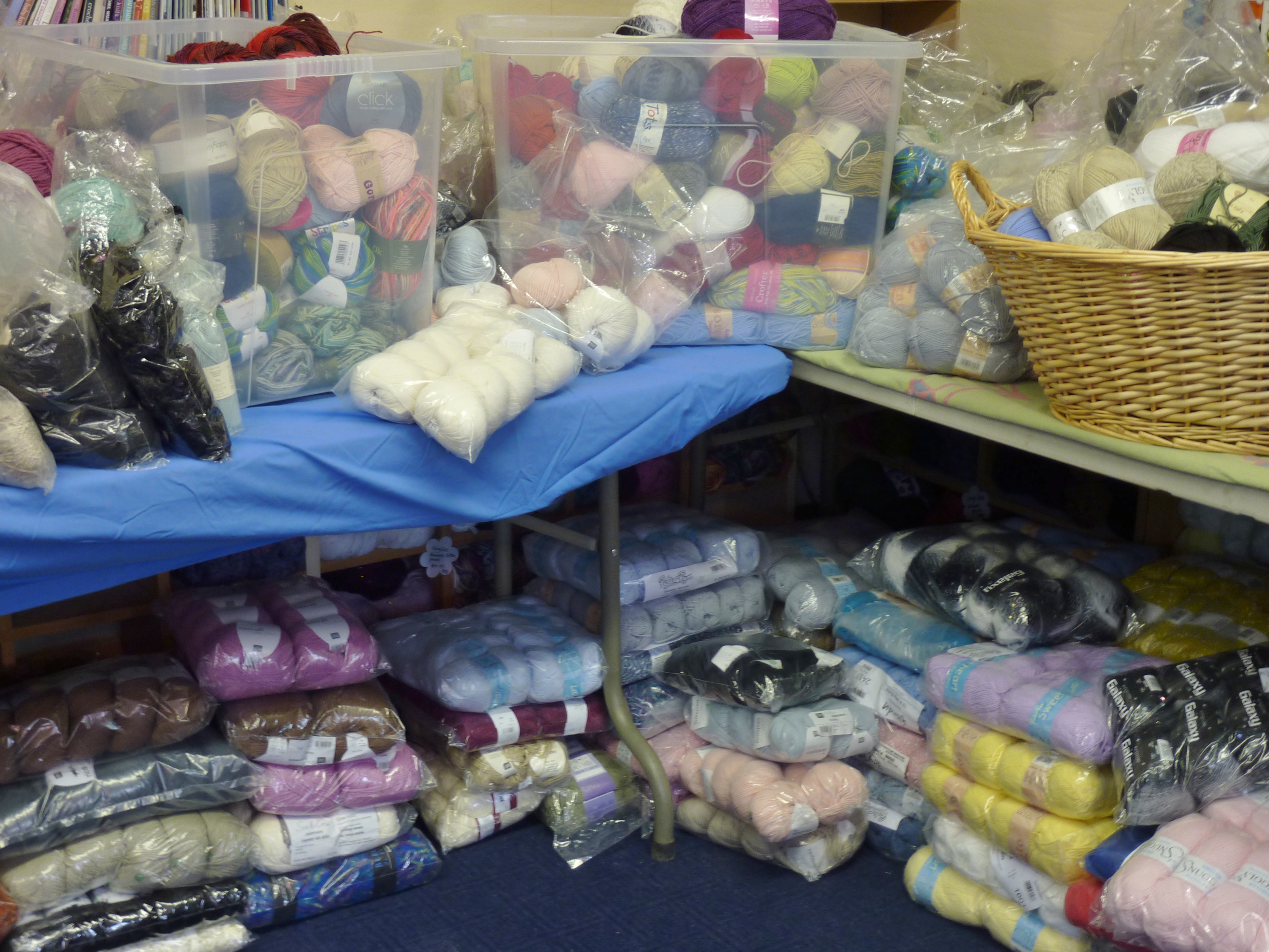 The second thing to go wrong was the sellotape ran out. I simply had too many packs of yarn to close up before the yarn decided to take over and engulf me. At this point I was sitting in the middle of the floor surrounded by boxes and baskets full of yarn while trying to make up full packs to make it easier on Wednesday.